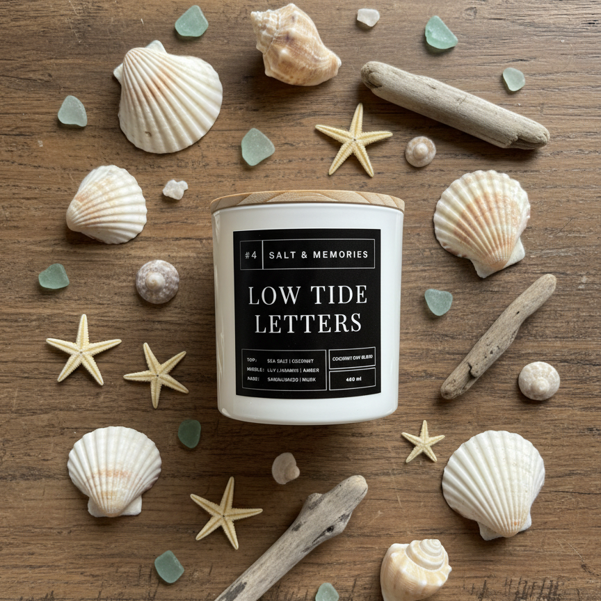 Our Low Tide Letters Candle is a calm, refined blend that captures the peaceful essence of a coastal escape. Opening with crisp sea salt and marine notes, it evokes the gentle rhythm of ocean waves. At its heart, soft coconut, lily of the valley, and jasmine add a delicate brightness, while smooth sandalwood, warm amber, and clean musk anchor the fragrance with a creamy, lingering finish.